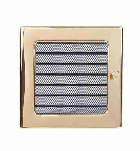 Grila de semineu cu jaluzea pentru controlul fluxului de aer. Rama eleganta, galvanizata si aurita ce isi pastreaza culoarea indiferent de temperaturile inalte.