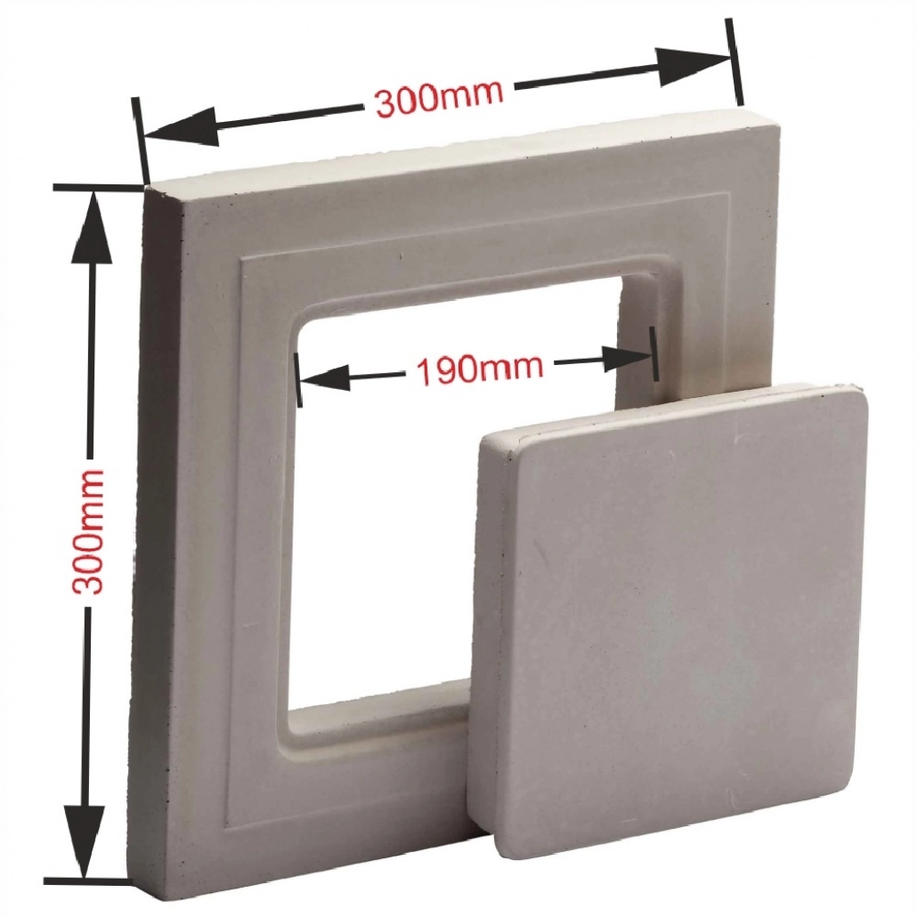 Capac ceramic de vizitare cu rama de montaj de forma patrata cu dimensiunea ramei de 30×30 cm si cea a golului de vizitare de 19×19 cm.