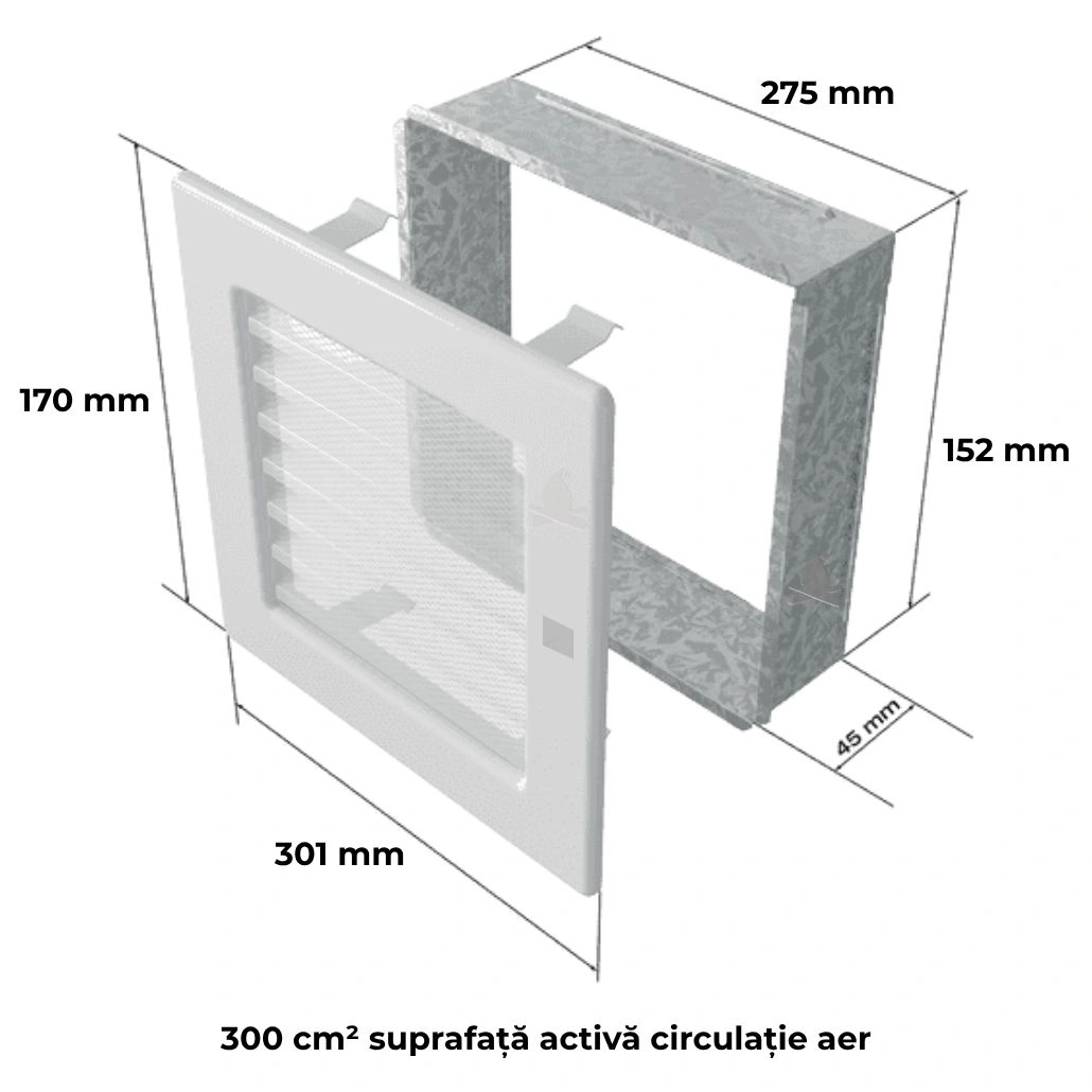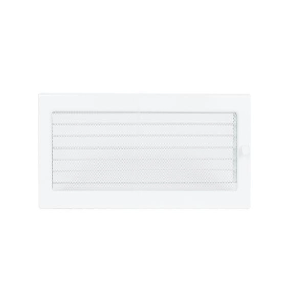Grila de aerisire pentru seminee, cu rol de evacuare a aerului cald din hota acestora. Varianta cu jaluzea si buton de control, culoare alba, dimensiuni 17 / 30 cm.
