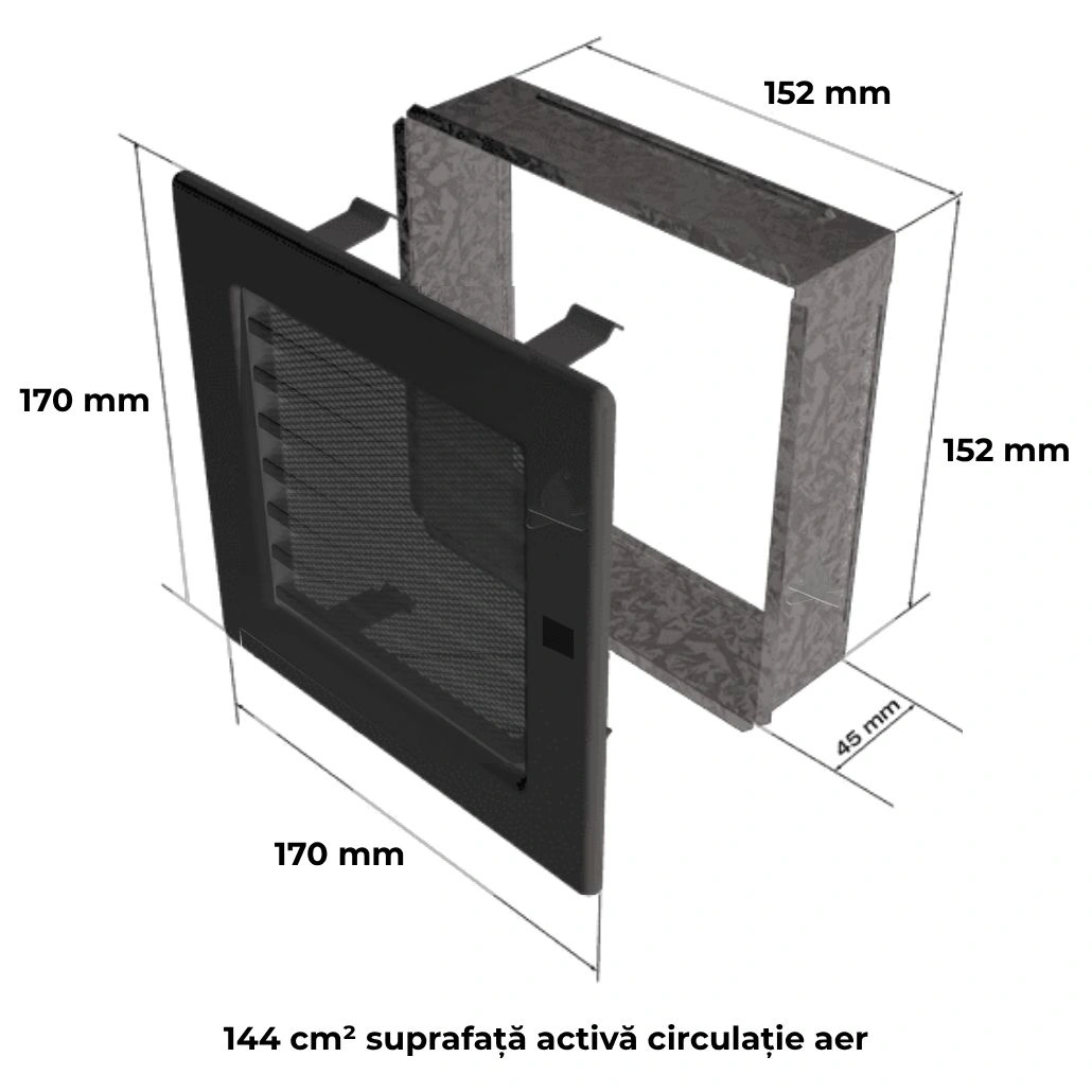 Grila culoarea graphit cu jaluzea, model simplu si clasic ce se potriveste cu orice ambianta, indiferent de stil. Dimensiuni 17 / 17 cm.