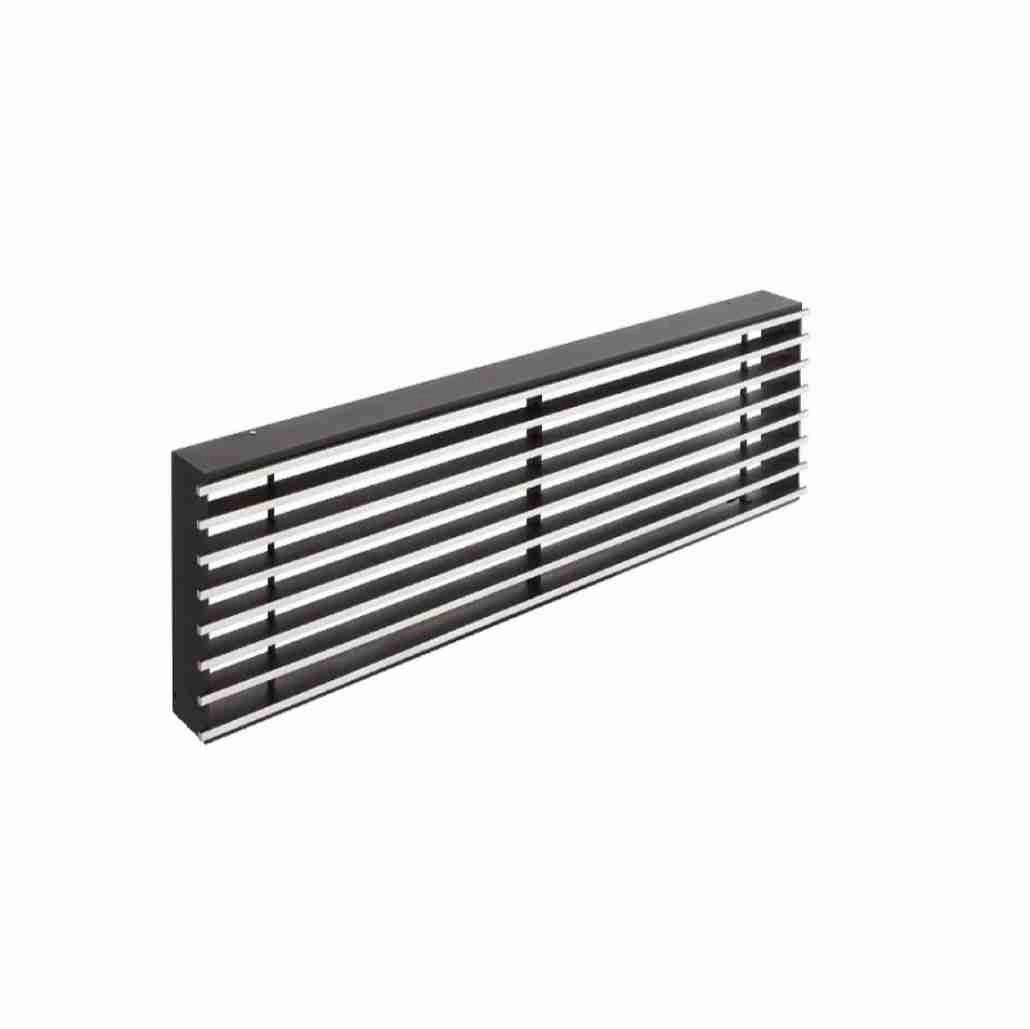 Grila de aerisire din inox slefuit, vopsita in culorile negru si argintiu. Are un aspect elegant si modern, potrivita pentru seminee pe lemne in stil modern.