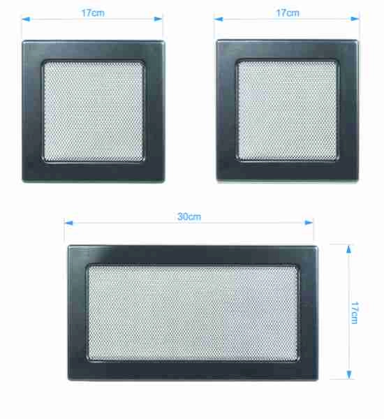 Set de 3 grile pentru seminee de putere maxima 12 kw, culoarea graphit. Setul contine 1 grila 17/30 cm si 2 grile 17/17 cm, cu sita si rama.