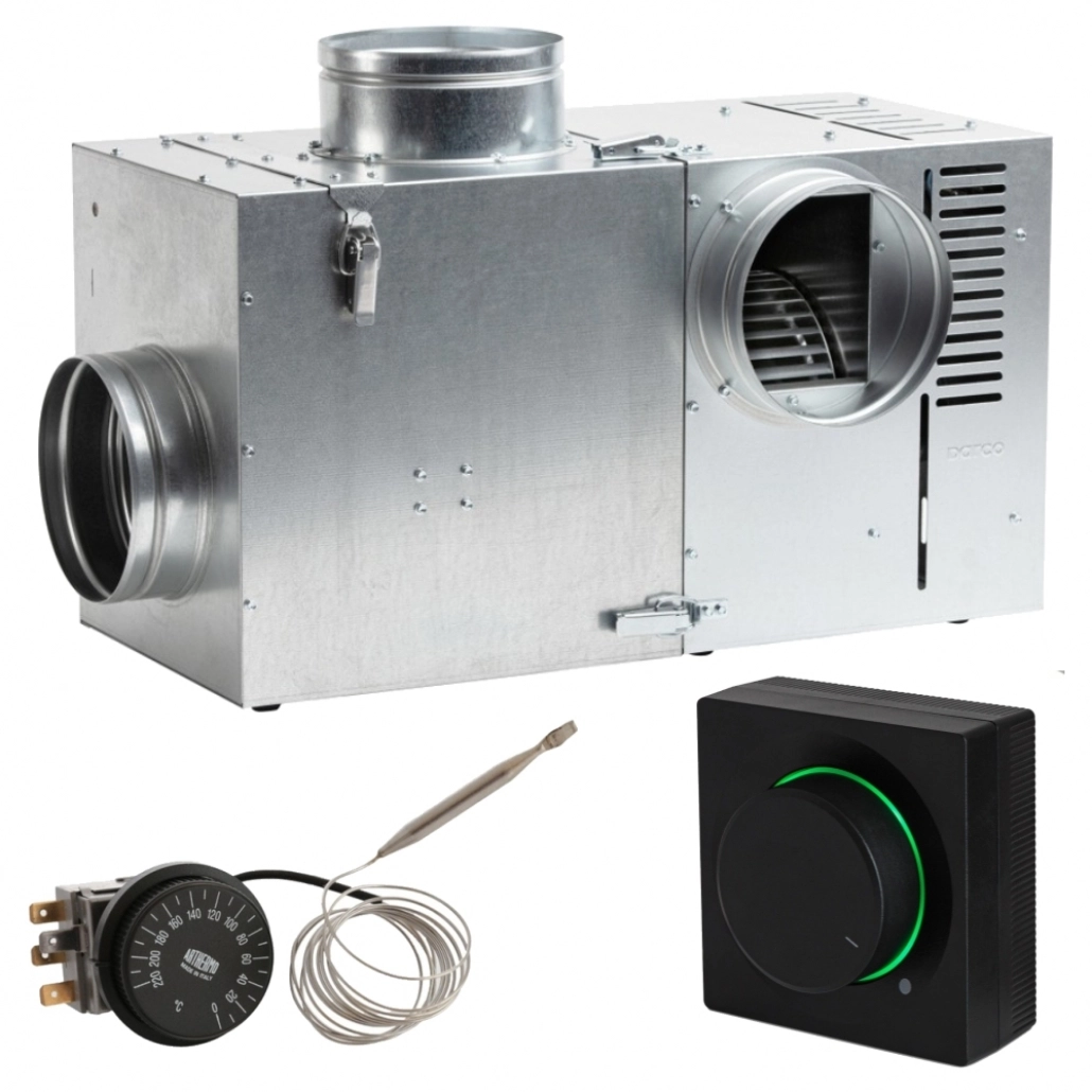 Ventilator Profesional pentru sistemul de distributie al aerului cald din hota semineului in mai multe incaperi in acelasi timp. Sistem de bypass cu clapeta gravitationala incorporat in caz de pana de curent sau supraincalizre. Setul contine si filtru detasabil pentru curatare.